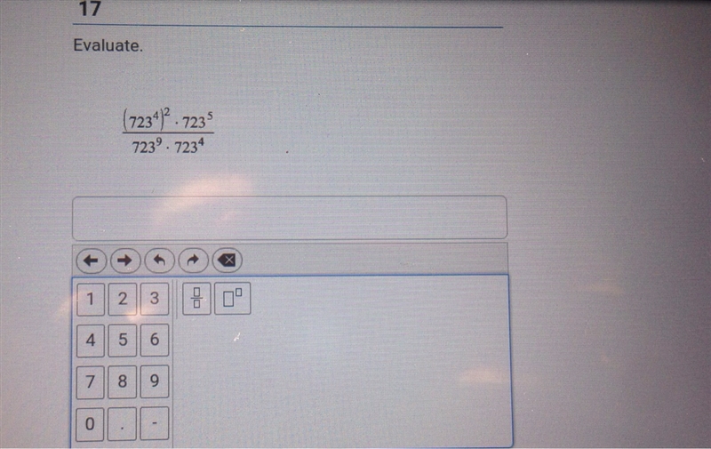 ok so what you want to do is multiply 2 tines 4 which is 8 then multiply 723 8 times into the calculator or just press the button next to the button on the left 8 times ok then do that again for 723^5 power so whatever product you get for the both of them multiply them then divide whatever product you get on to top to the bottom oops sorry that is the long way so basically 4 times 2 is 8 now that plus 5 = 13 so now on the top half we have 723^13 and on the bottom it is the same thing so divide your answer is 1