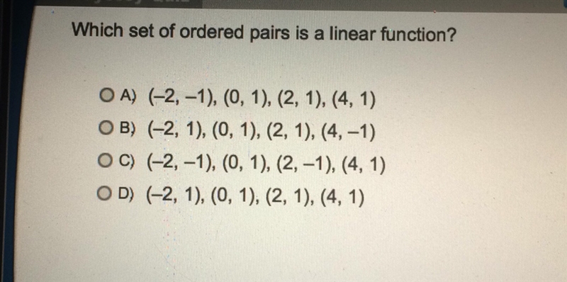 Which set of ordered pairs is a linear function?O A) (-2, -1), (0, 1), (2, 1), (4, 1)O B) 12, 1), (0,1), (2, 1), (4,-1)O C (-2, -1), (0, 1), (2,-1), (4, 1)O D (-2, 1), (0, 1), (…