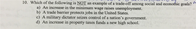 10. Which of the following is NOT an example of a trade-off among social and economic goals?
