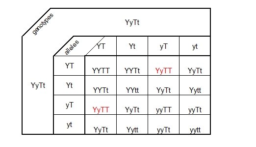 Parents: YyTt x YyTtAs shown in image, there will be in total 16 different genotypes. Two of them are YyTT genotypes. So the probability that the offspring will show YyTT genotype is 2 of 16:= 2/16 = 1/8
