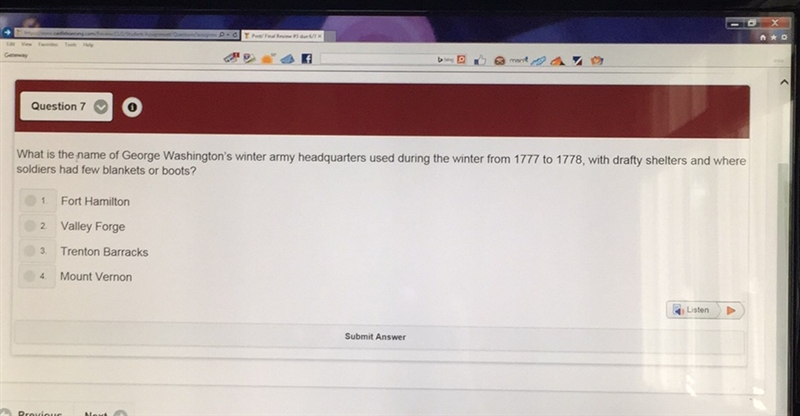 Question 7oWhat is the name of George Washington's winter army headquarters used during the winter from 1777 to 1778, with drafty shelters and wheresoldiers had few blankets or boots?1, Fort Hamilton2 Valley Forge3. Trenton Barracks4. Mount Vernon