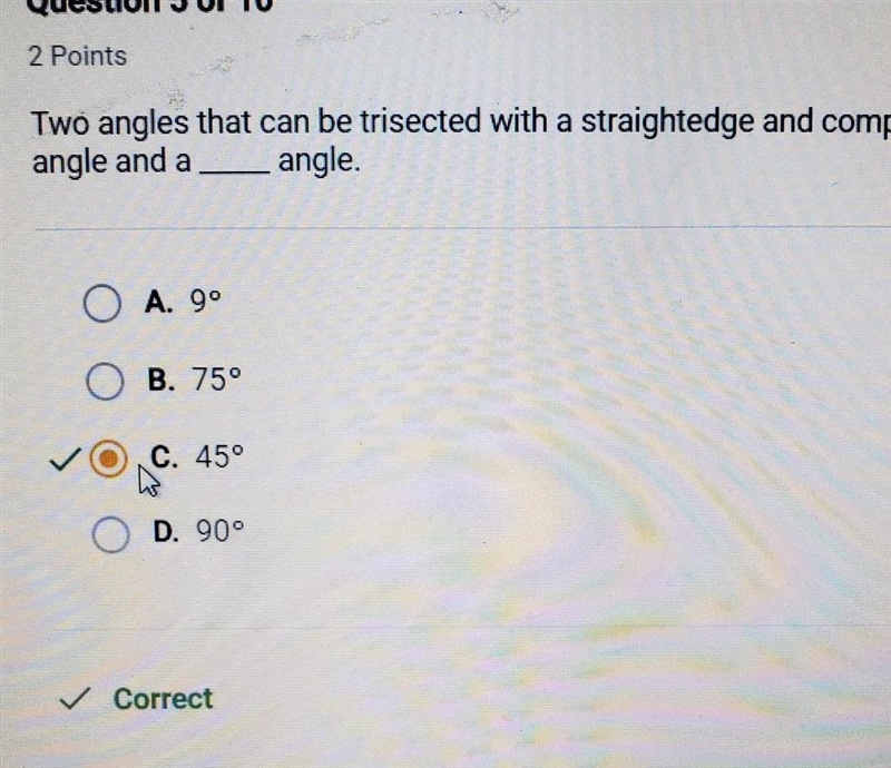Two angles that can be trisected with a straightedge and compass are a 90angle and a _____ angle. A. 9 B. 75 C. 45 D. 90