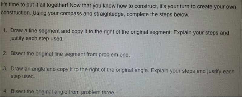 It's time to put it all together! Now that you know how to construct, it's your turn to create your ownconstruction. Using your compass and straightedge, complete the steps below.1. Draw a line segment and copy it to the right of the original segment. Explain your steps andjustify each used.2. Bisect the original line segment from problem one.3. Draw an angle and copy it to the right of the original angle. Explain your steps and justify eachstep used4. Bisect the original angle from problem three