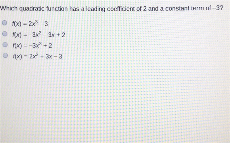 Which quadratic function has a leading coefficient of 2 and a constant term of -3?f(x) 2x3-3f(x) -3x3 2f(x) 2x 2 3x 3