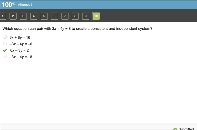Which equation can pair with 3x + 4y = 8 to create a consistent and independent system?6x + 8y = 16.A –3x – 4y = –6.B 6x – 3y = 2.C –3x – 4y = –8.D