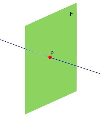 The intersection of a line and a plane is a point that lies both on the line and the plane F. This is illustrated in the figure below. You can see that the point of intersection is P. What this intersection means is that the line passes through the plane F.
