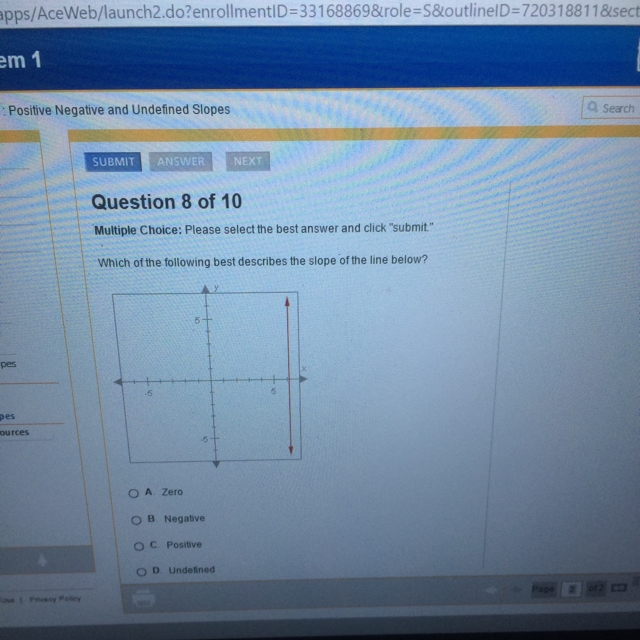 its udefined because the question asked describe the line of a slope, now its not negative or positive because there is no change. Its undefined because its a line, going vertical way