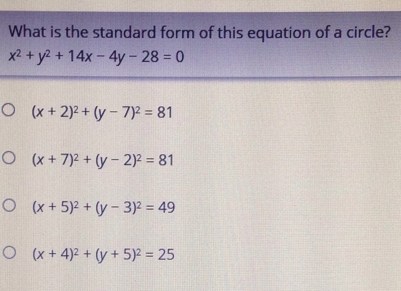 What is the standard form of this equation of a circle? (X+2)^2 + (y-7)^2=81
