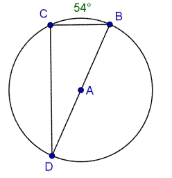 Points B, C, D lie on Circle A; line segment BD is the diameter of circle A; measure of arc CB is 54 degrees.