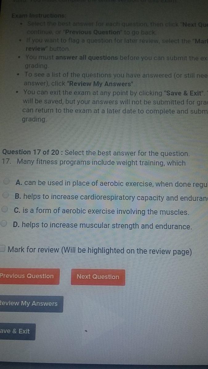 D is the answer, because aerobic is with breath and weight training doesn't involve that