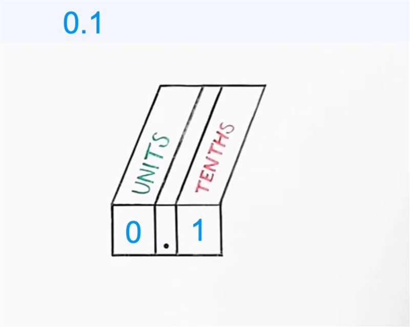 Using the place value chart, we can see that the decimal 0.1 is one tenth, so we can write 0.1 as the fraction 1 out of 10 or