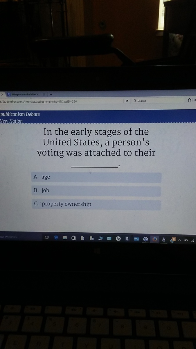 In the early stages of the united states, a person's voting was attatched to their _____. A. age B. job C. property ownership