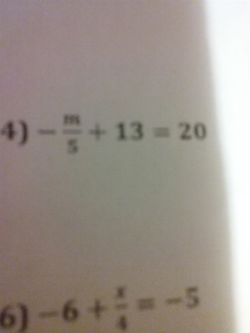 If this problem is: -m/5 + 13 = 20 Solve: -m/5 = 20 - 13 -m/5 = 7 -m = 7(5) -m = 35 m = -35