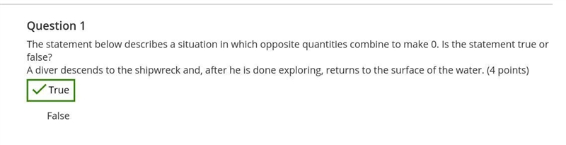He statement below describes a situation in which opposite quantities combine to make 0. Is the statement true or false? A diver descends to the shipwreck and, after he is done …