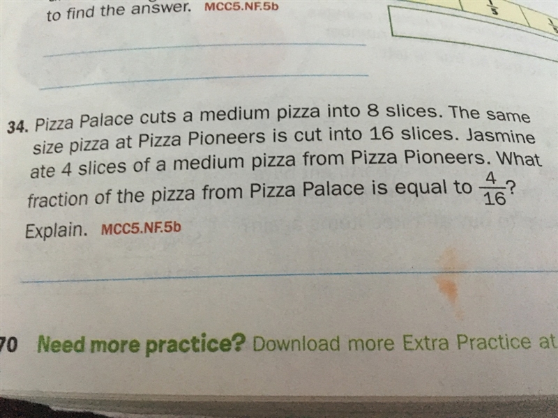 Pizza Palace cuts a medium pizza into 8 slices. The same size pizza at pizza pioneers is cut into 16 slices. Jazmine ate four slices of a medium pizza from pizza pioneers what f…