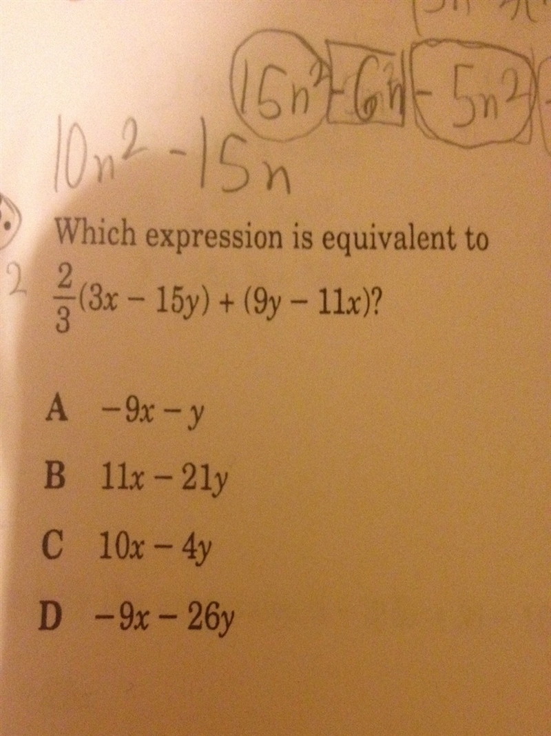 Whats the answer to this in the picture? 2/3(3x-15y)+(9-11x)