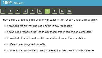 1) Low interest home loans- This allowed more families to buy homes rather than rent. Home ownership is often a key sign of a strong economy so when this bill passed, it helped the economy tremendously during the 1950's.