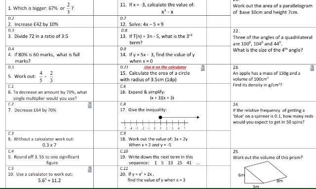 1.67% is bigger 2. £46.2. 3.? Sorry 4.72. 5.2 over 15 6.? 7. 19.2 8. 2.1 9. 3.5 10. 186.816 11. -24 12.x=1 13. 9n-15 14.??? 15??? 16??? 17. ??? Sorry ran out of time hope this helps