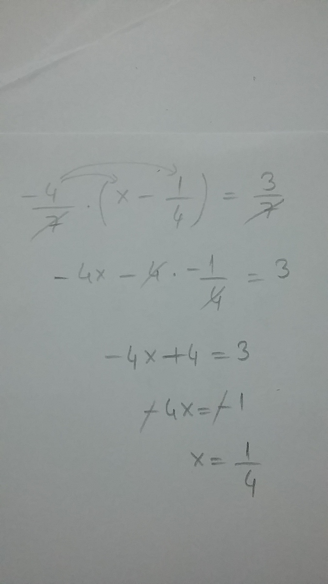 I'm really stuck on these fraction problems. Can anyone help me on finding the solution for -4/7 (x- 1/4) = 3/7 ?