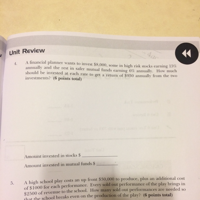 Then we set up our equation which is a sum of the 15% return and the 6% return and we let that sum equal our desired return on investment ($930). Then solve for x.