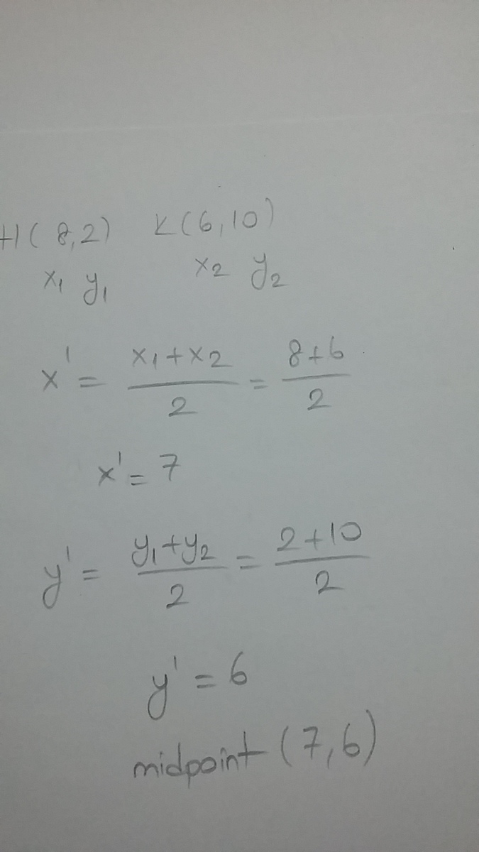 Find the Coordinates of the midpoint of the segment whose endpoints are H(8,2) and K(6,10)