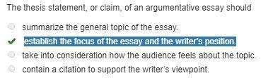 The thesis statement, or claim, of an argumentative essay should