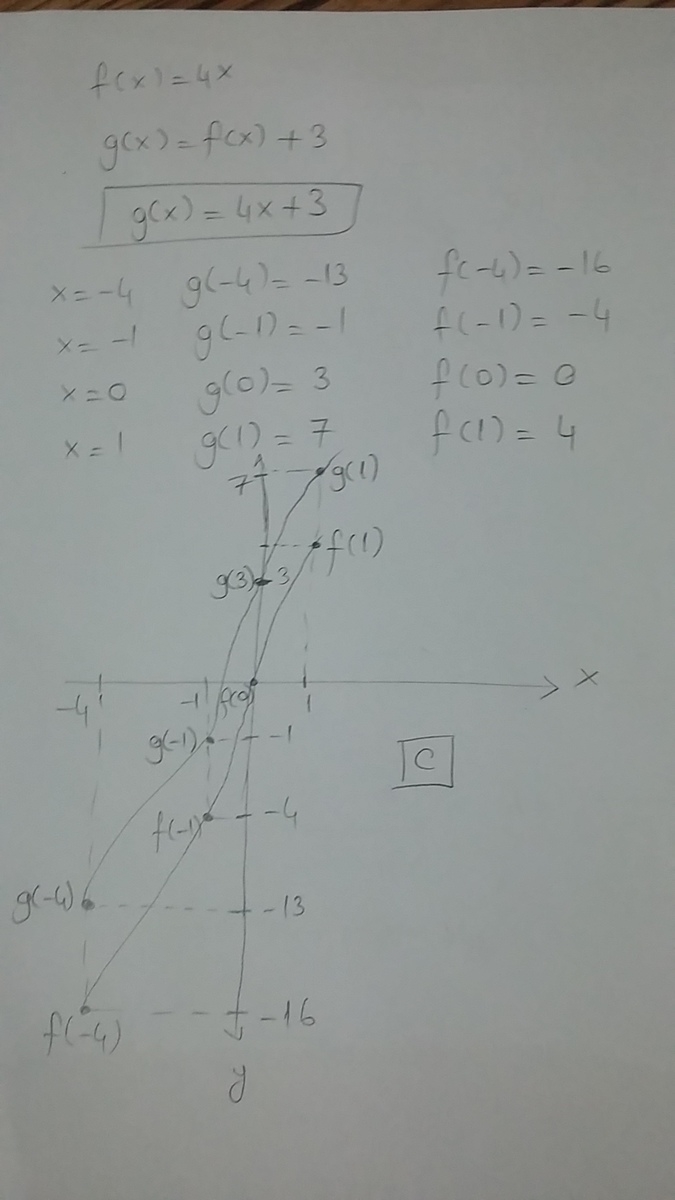Which statement correctly describes the relationship between the graph of f(x)=4x and the graph of g(x)=f(x)+3 ?