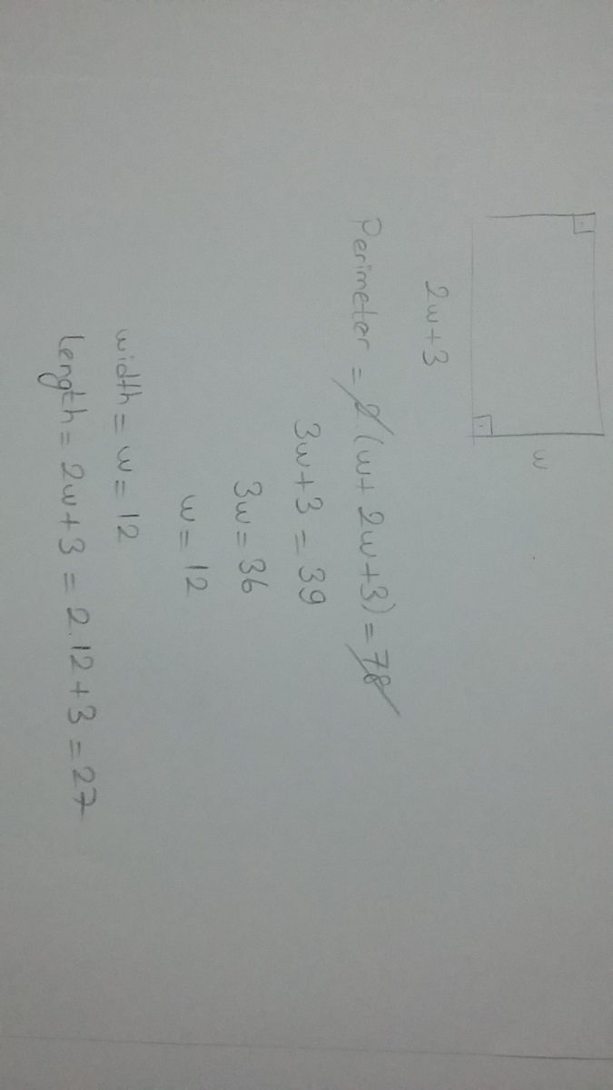 The length of a rectangle is 3 cm more than twice the width the perimeter 78 cm defined a variable and right and solve the equation to find out how long and how wide the rectangle is