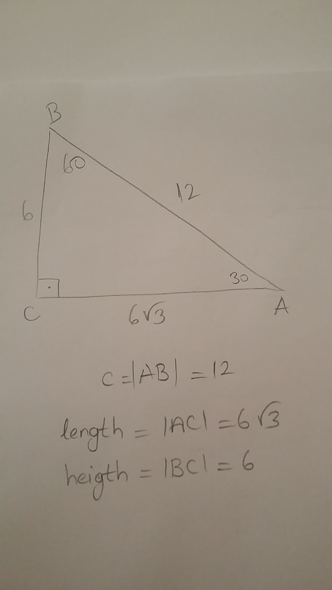 A right triangle has the hypotenuse c = 12 cm and an angle A = 30 degrees . Find the length of a side a , which is opposite angle A
