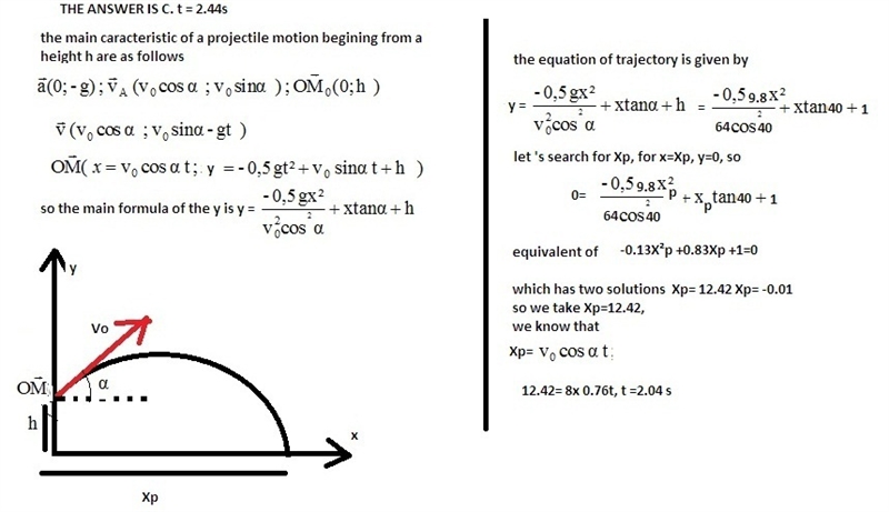 A child throws a ball with an initial speed of 8.00 m/s at an angle of 40.0Á above the horizontal. The ball leaves her hand 1.00 m above the ground. How long is the ball in flight before it hits the ground?