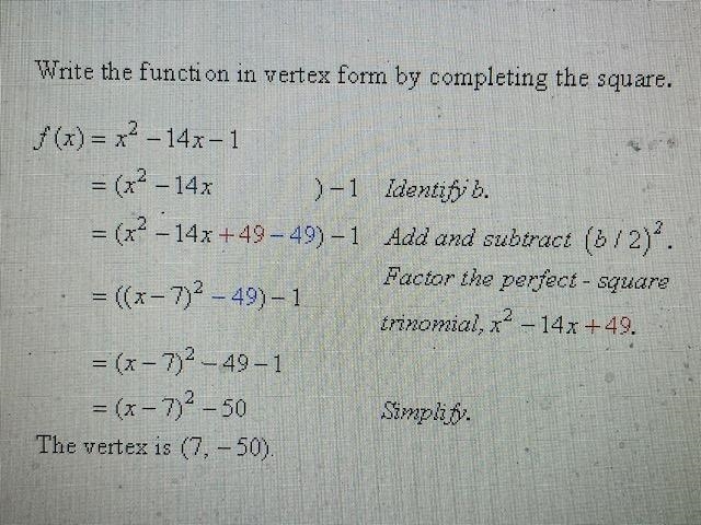Answer: f(x) = (x − 7)2 − 50; (7, −50)