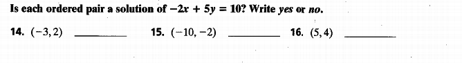 14)NO..... -2x+5y=10.....-2(-3)+5(2)=10.....6+10 is not =10