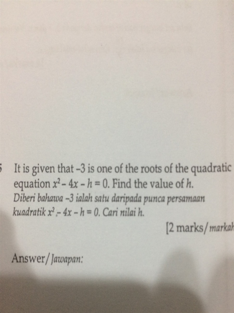 It is given that -3 is one of the roots of the quadratic equation x square -4x-h=0.find the value of h