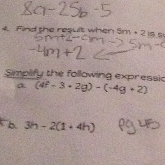 (4f-3+2g)-(-4g+3). 4f-3+2g+4g-2. Answer is 4f-5+6g