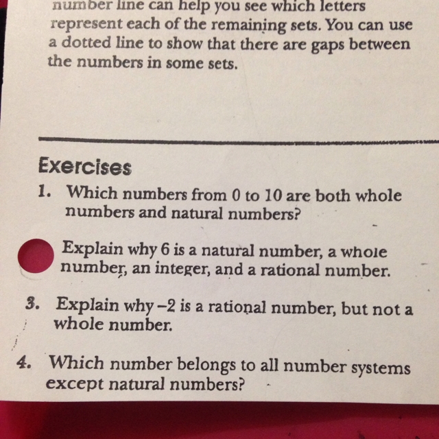 2.) 6...it is a natural number because it is a counting number and it is whole, it is a whole number and it is an integer as well. It is also rational because it can be turned into a fraction 6/1.