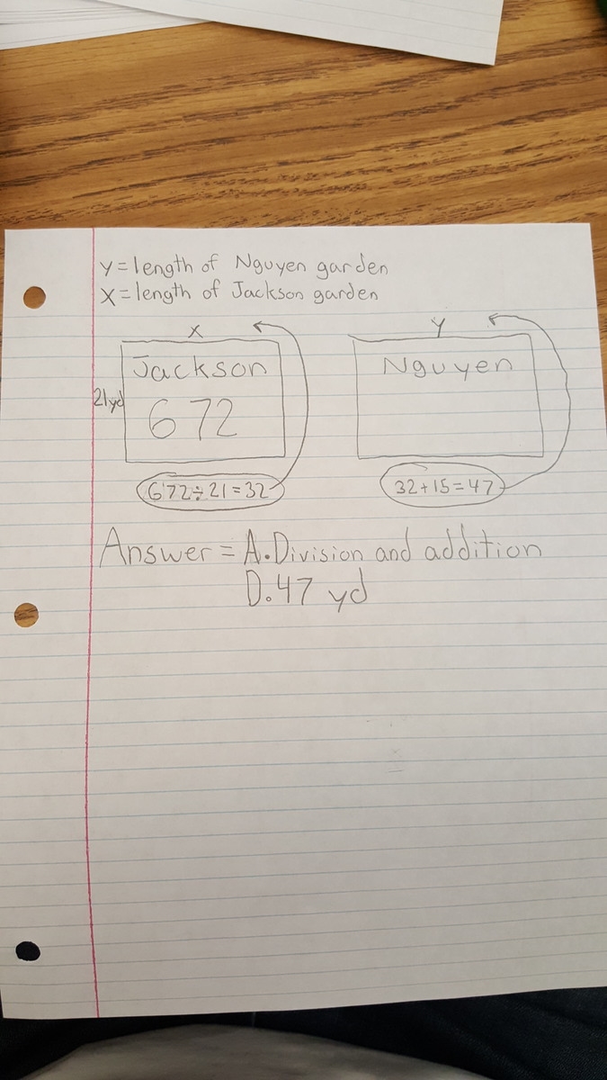 Which operations are the most efficient to use to solve the problem and what is the solution? The Jackson neighborhood has a community garden that has an area of 672 square yards. The width of the garden is 21 yards. The length of the Nguyen neighborhood garden is 15 yards longer than the length of the Jackson garden. What is the length of the Nguyen neighborhood garden? Choose exactly two answers that are correct. A. division and addition B. multiplication and addition C. 330 yd D. 47 yd ....plz hurry