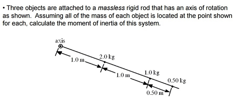 Three objects are attached to a massless rigid rod that has an axis of rotation as shown. Assuming all of the mass of each object is located at the point shown for each, calculate the moment of inertia of this system.