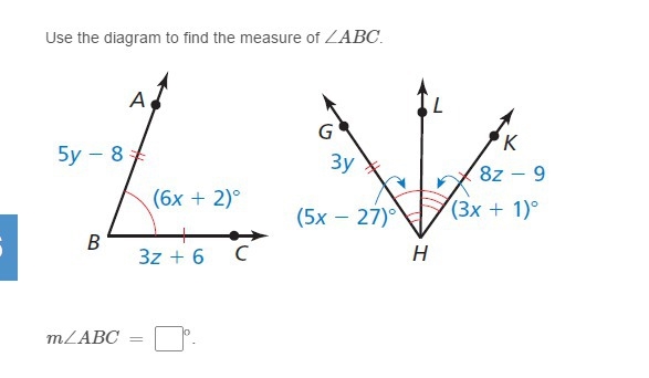 measure of abc would be 6x+2 or 6(14)+2 or 86 degrees
