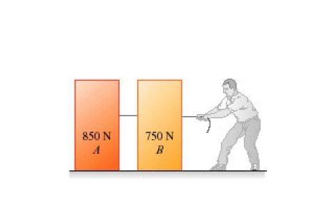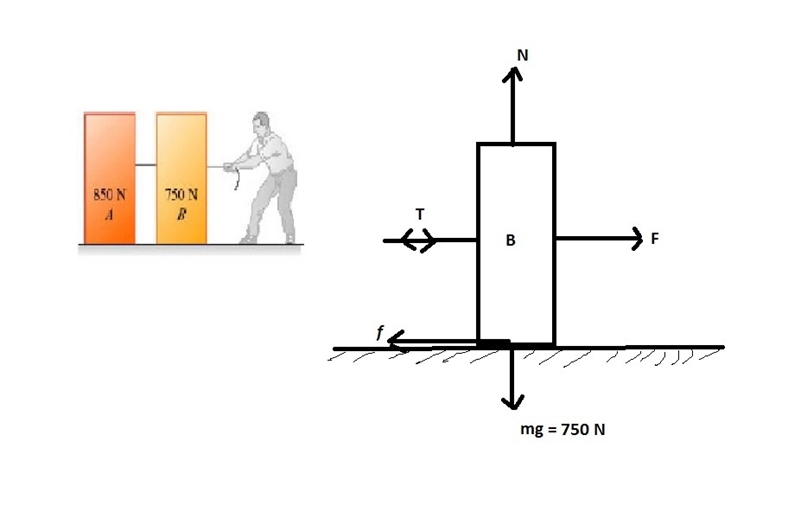 The worker pulls the boxes. The force (F) on box B acts towards right direction. The weigh (mg) of the box acts in the downward direction where as reaction force -Normal force (N) acts in the upward direction.