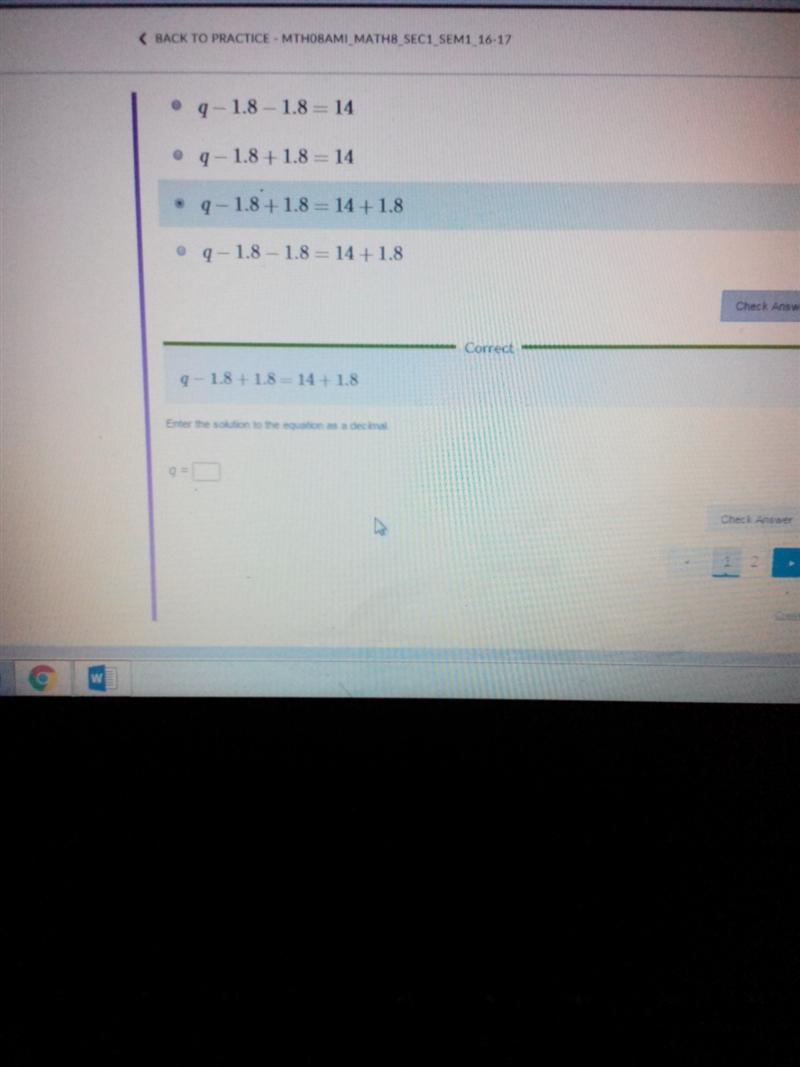 It says solution to the equation as a decimal q-1.8+1.8=14+1.8