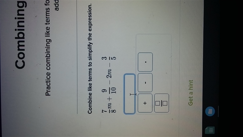 The simplified expression is - 7/8 m + 3/10
