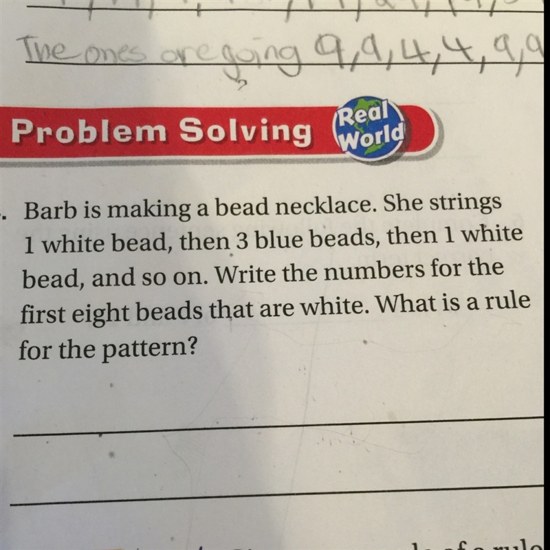 Barb is making a bead necklace.She strings 1 white bead,then 3 blue beads,then 1 white bead,and so on.Write the numbers for the first eight beads that are white.What is the rule for the pattern?