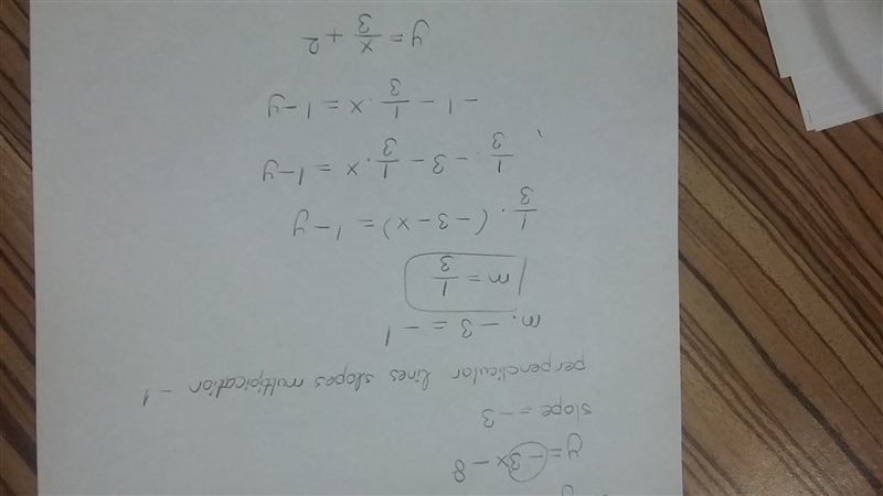 Write the equation of the line perpendicular to 3x+y=-8 that passes through (-3,1) . Write your answer in slope-intercept form.