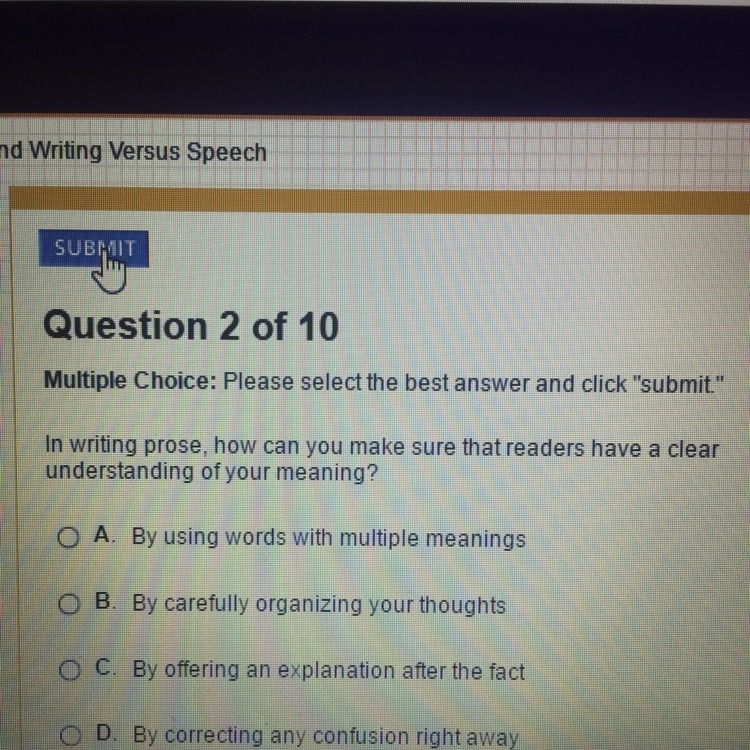 In writing prose, You can make sure that readers have a clear understanding of your meaning by carefully organizing your thoughts. Option B is correct.