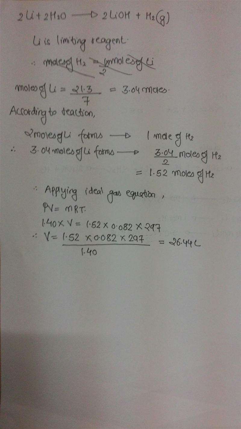 If 21.3 grams of lithium react with excess water, how many liters of hydrogen gas can be produced at 297 kelvin and 1.40 atmospheres?