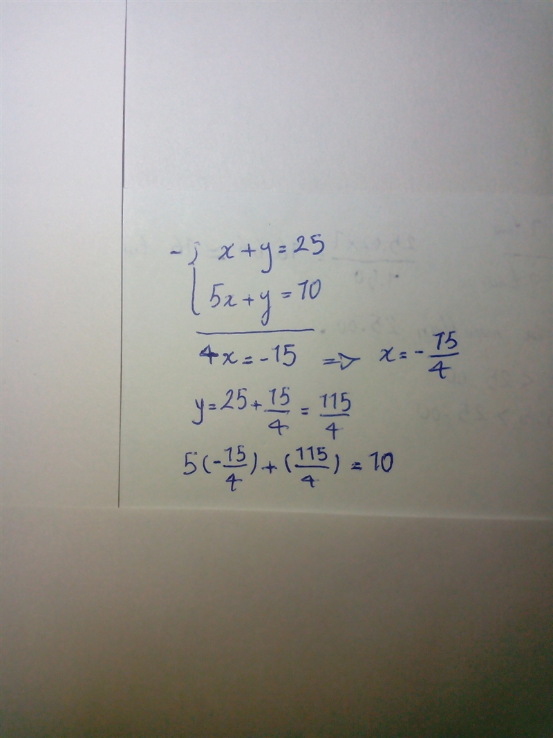 Determine the expression you can substitute for x in 5x +y=10 to solve the system below x+y=25 5x+y=10
