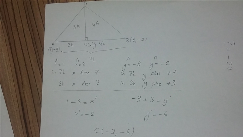 ((4(1) + 3(8))/7, (4(-9) + 3(-2))/7) = ((4 + 24)/7, (-36 - 6)/7) = (28/7, -42/7) = (4, -6)