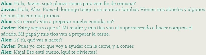 1. What is Javier planning to do this weekend? 2. Who is coming to visit Javier? 3. Javier invited Alex to the family reunion. True or False?
