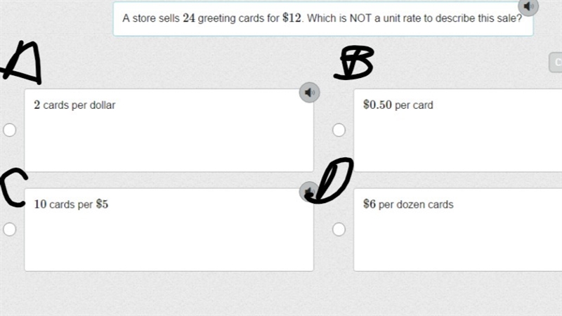 A store sells 24 greeting cards for $12. Which is NOT a unit rate to describe this sale?