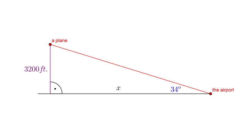 the angle of depression from a plane to the airport is 34°. the pilot reports that the plane's altitude is 3200 feet . find the horizontal distance between the plane and the airport to the nearest foot
